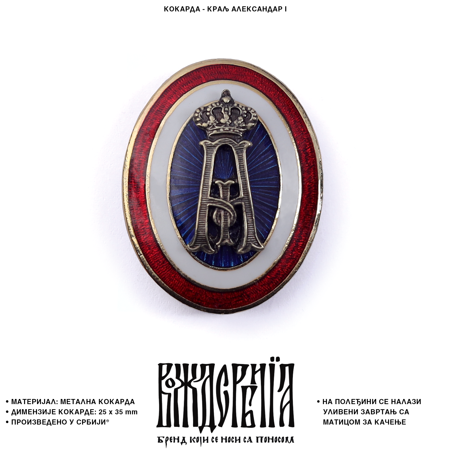 Кокарда за официрску капу из периода Краљевине Југославије (Краљевина Срба, Хрвата и Словенаца). Кокарда је овалног облика, на средишњем делу се налази Краљевски монограм Краља Александра I, на плаво-бело-црвеној основи (југословенски редослед боја).